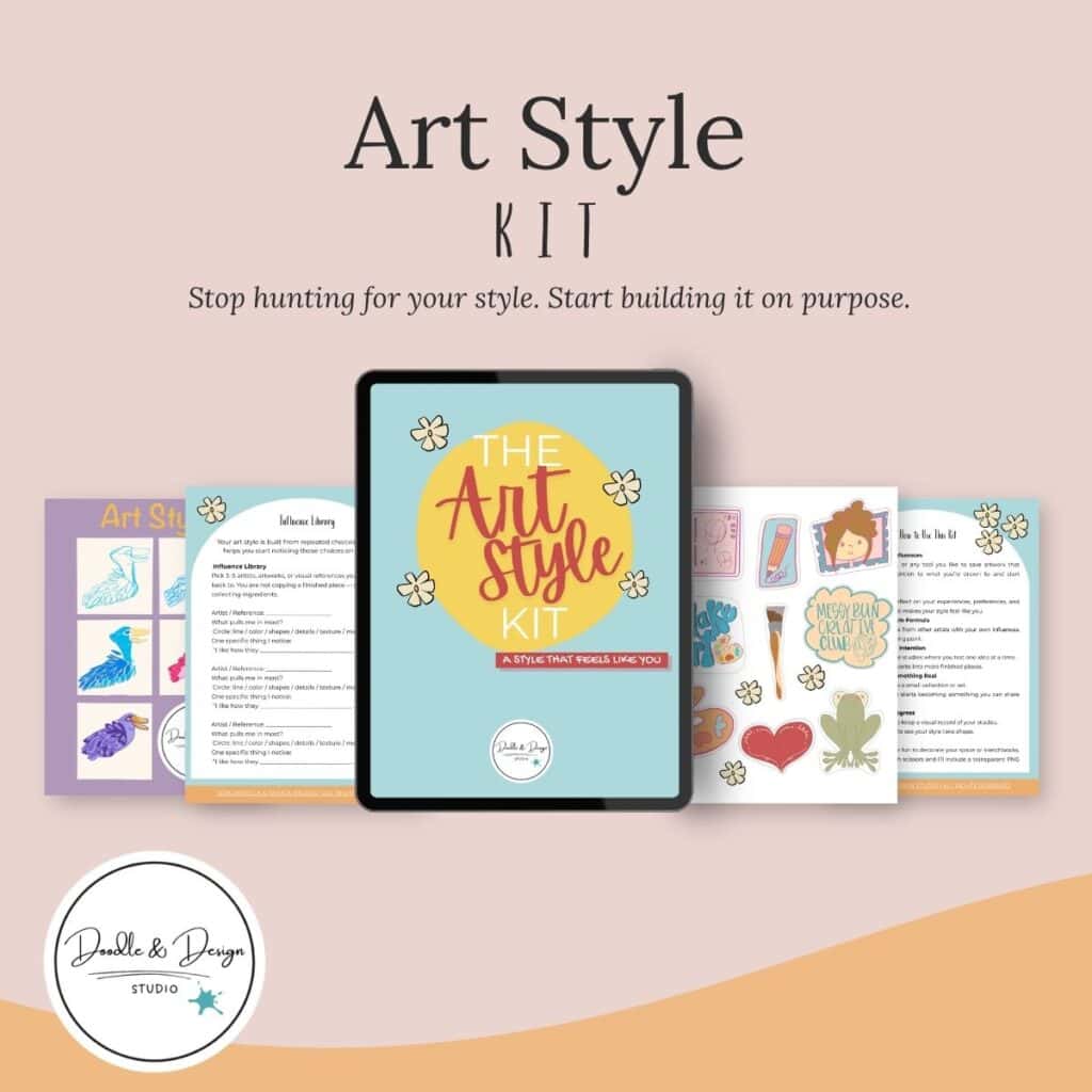 The Art Style Kit helps you stop guessing and start building your art style with simple exercises, a clear workbook, a gallery page to track your progress, and a set of fun hand-drawn artist stickers.